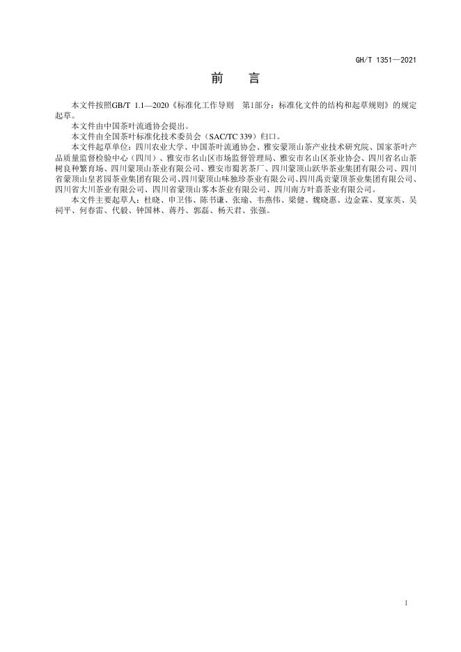四川农业大学、中国茶叶流通协会、雅安蒙顶山茶产业技术研究院、国家茶叶产品质量监督检验中心(四川)、雅安市名山区市场监督管理局、雅安市名山区茶业协会、四川省名山茶树良种繁育场、四川蒙顶山茶业有限公司、雅安市蜀茗茶厂、四川蒙顶山跃华茶业集团有限公司、四川省蒙顶山皇茗园茶业集团有限公司、四川蒙顶山味独珍茶业有限公司、四川禹贡蒙顶茶业集团有限公司、四川省大川茶业有限公司、四川省蒙顶山雾本茶业有限公司、四川南方叶嘉茶业有限公司