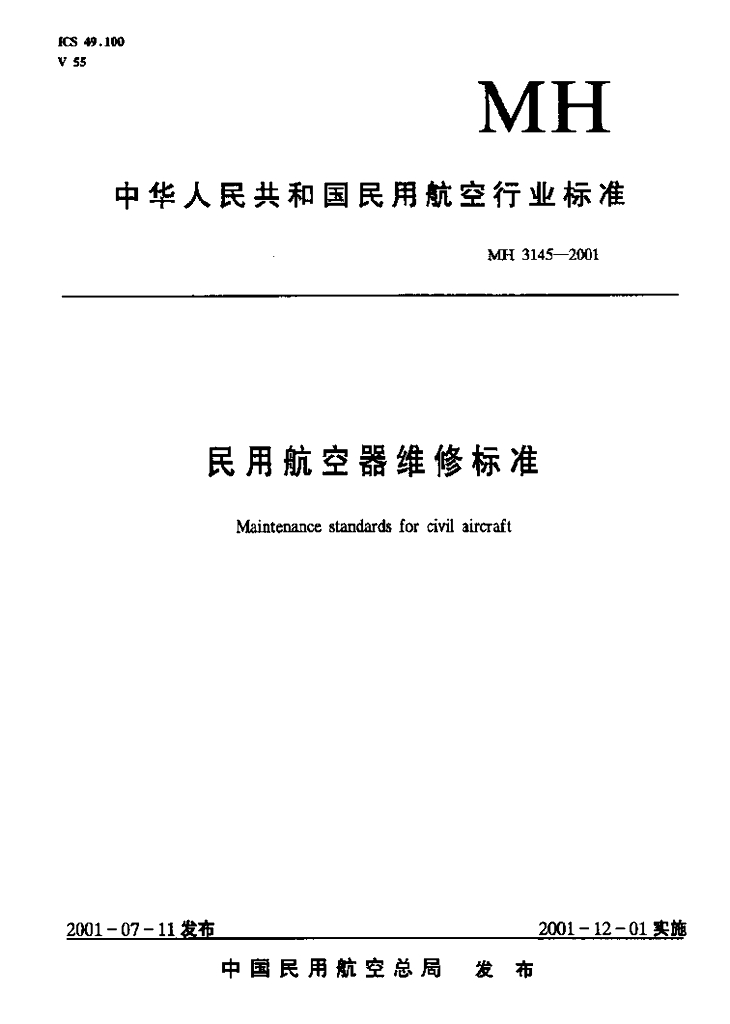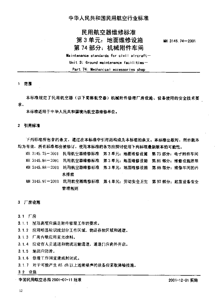 MH 3145.74-2001 民用航空器维修标准 第3单元 地面维修设施 第74部分 机械附件车间