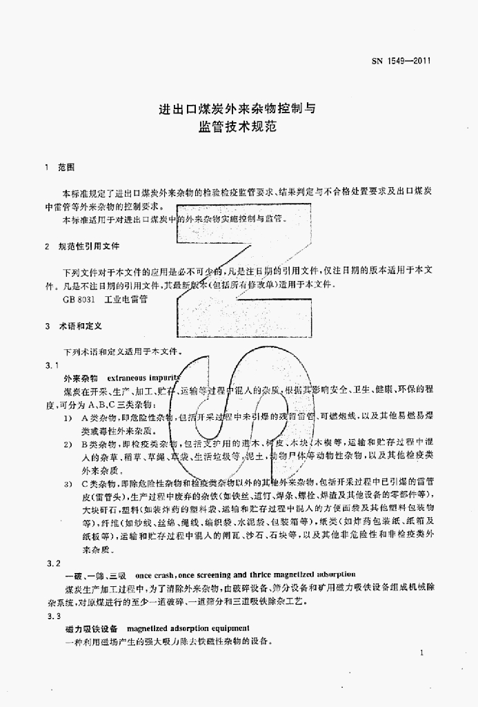 SN 1549-2011 进出口煤炭外来杂物控制与监管技术规范