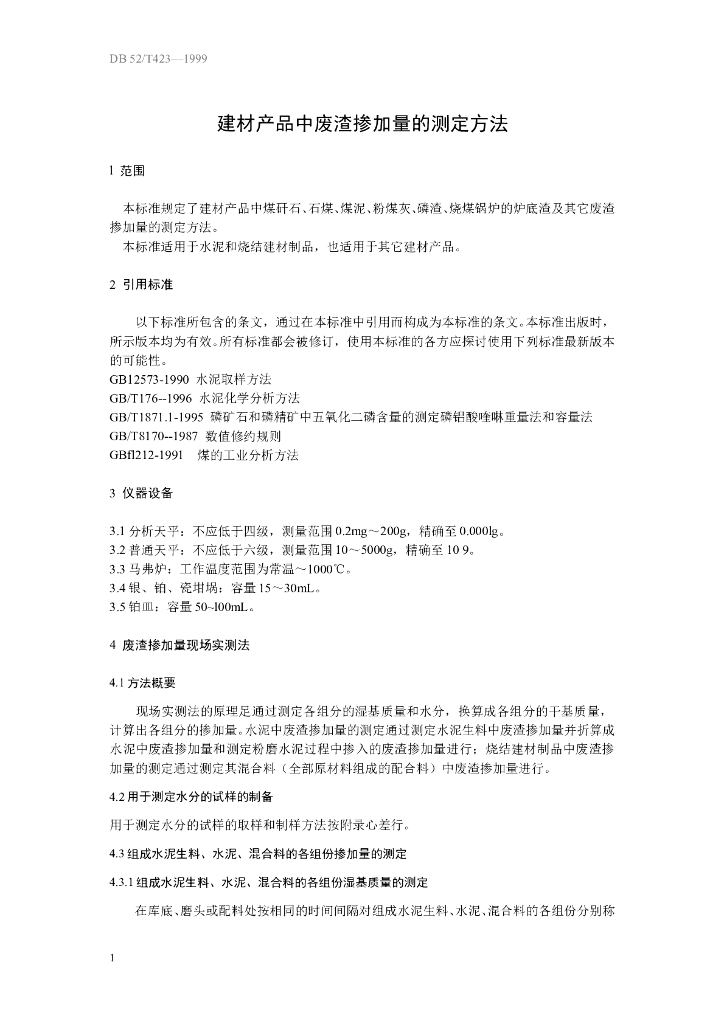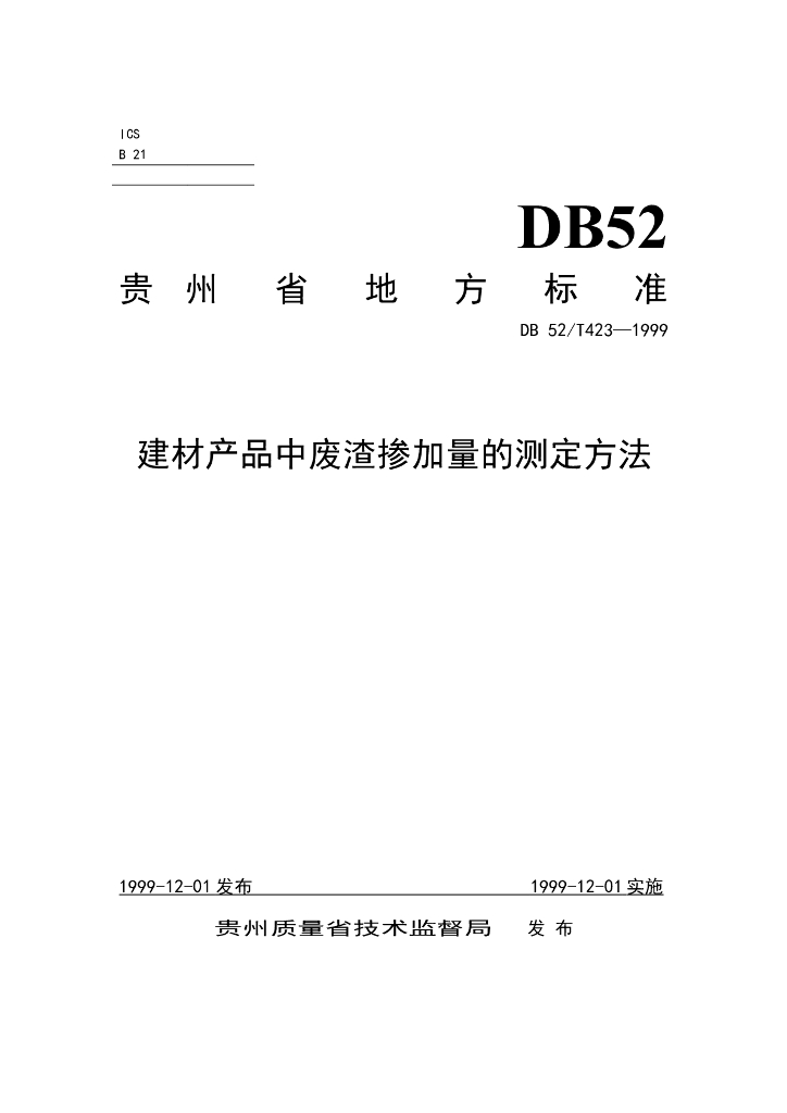 DB52/T 423-1999 建材产品中废渣掺加量的测定方法