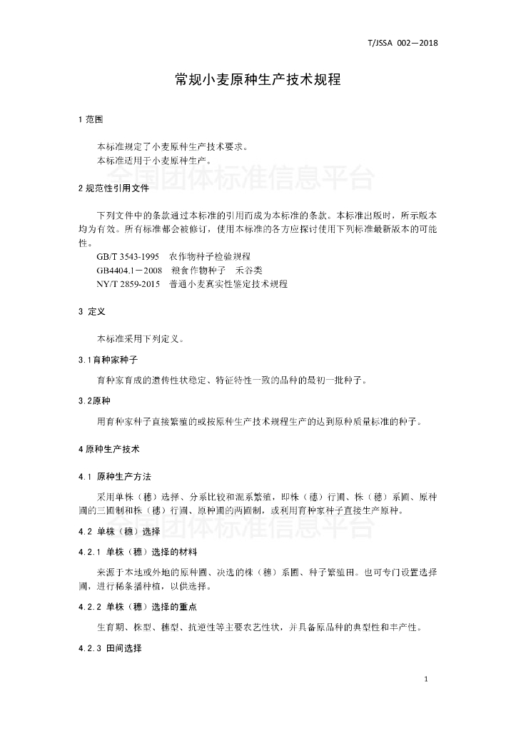 T/JSSA 002-2018 常规小麦原种生产技术规程
