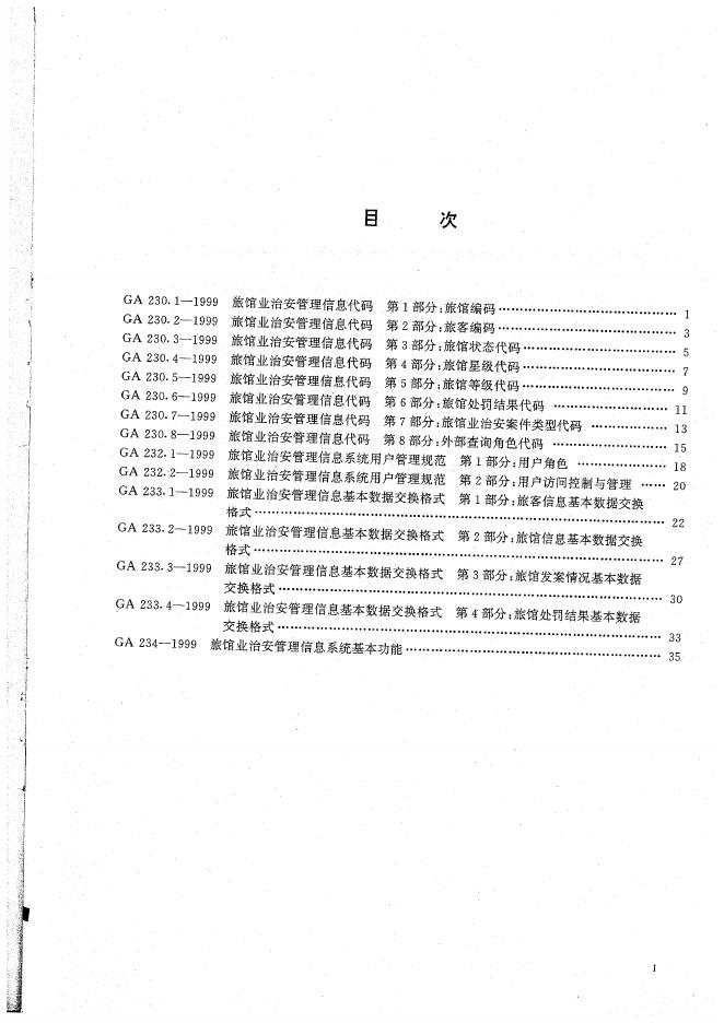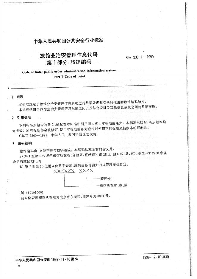 GA 230.1-1999 旅馆业治安管理信息代码 第一部分 旅馆编码