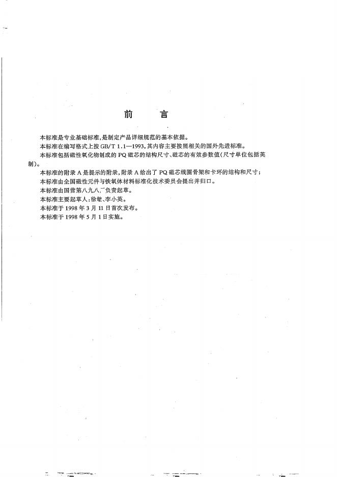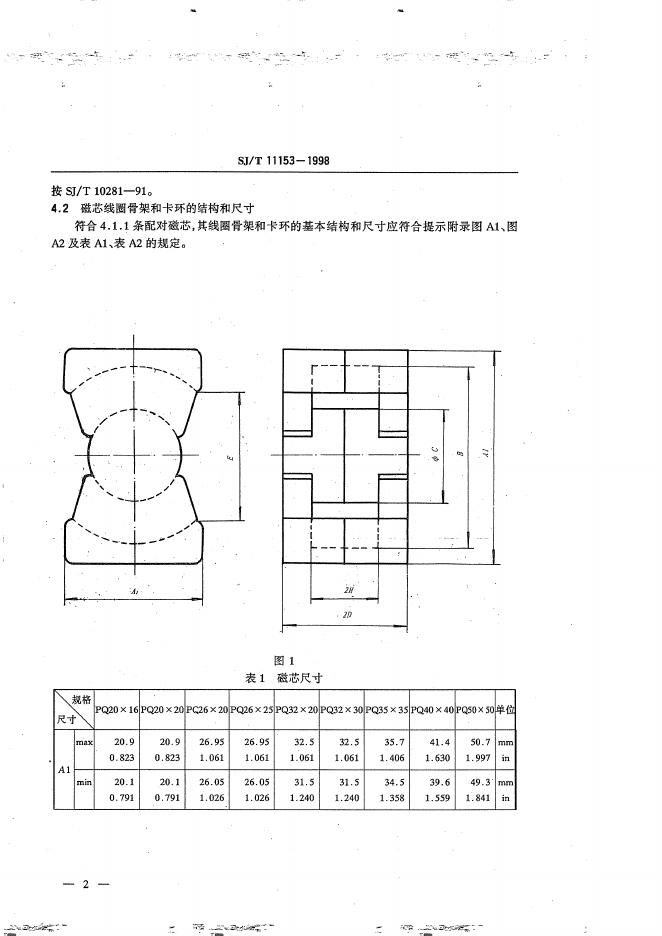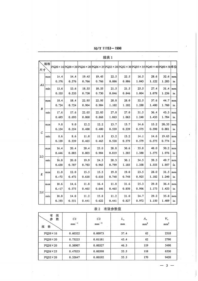 SJ/T 11153-1998 磁性氧化物制成的PQ磁芯尺寸系列