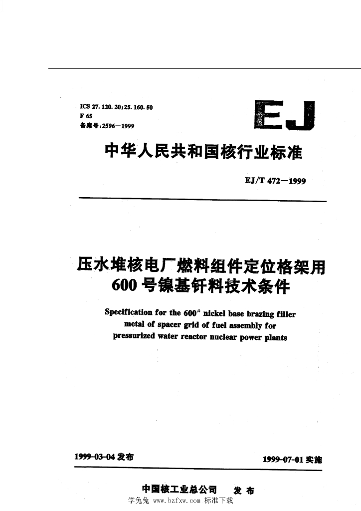EJ/T 472-1999 压水堆核电厂燃料组件定位格架用600号镍基钎料技术条件