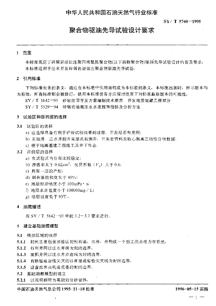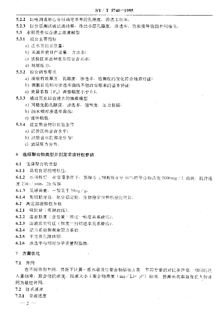 SY/T 5740-1995 聚合物驱油先导试验设计要求