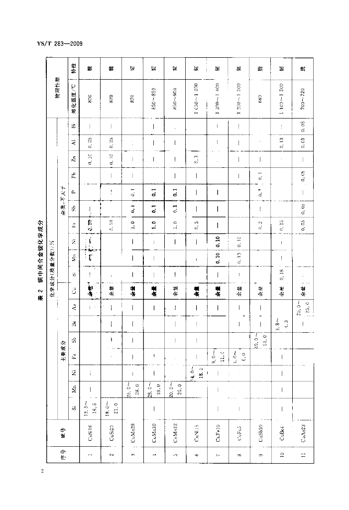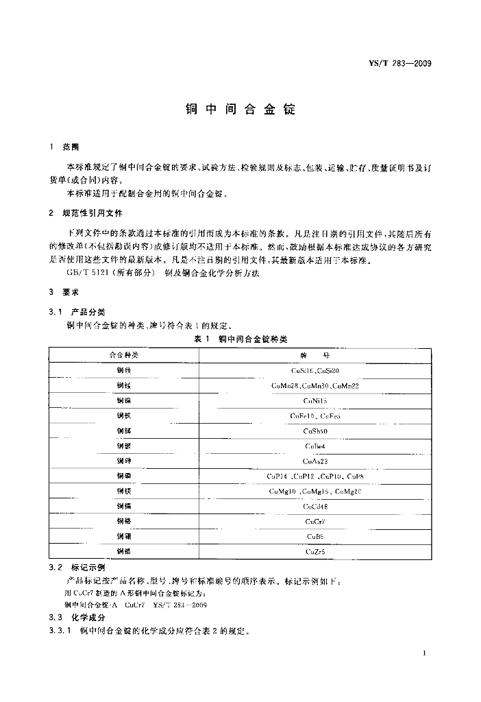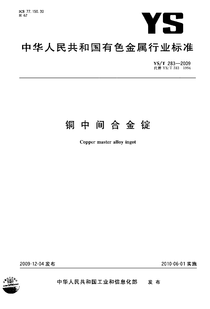 YS/T 283-2009 铜中间合金锭