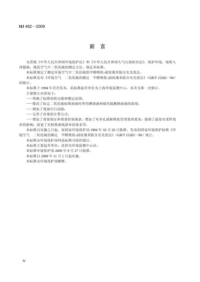 HJ 482-2009 环境空气 二氧化硫的测定 甲醛吸收-副玫瑰苯胺分光光度法