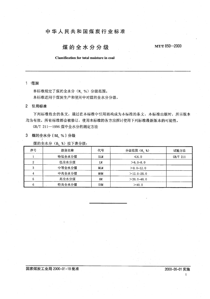 MT/T 850-2000 煤的全水分分级
