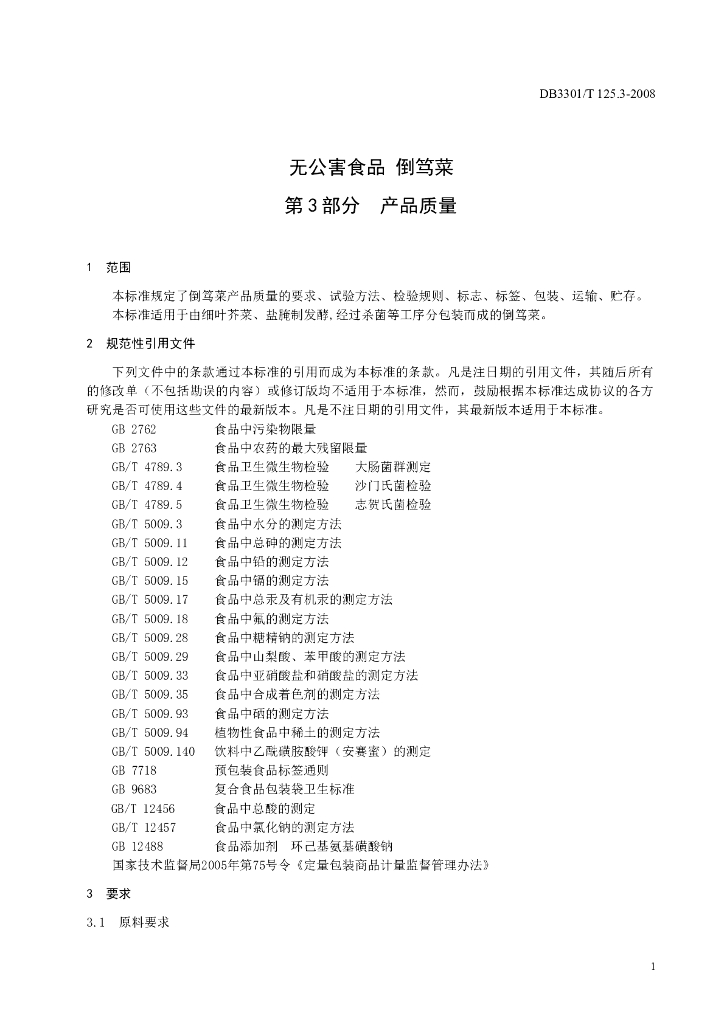 DB3301/T 125.3-2008 无公害食品 倒笃菜 第3部分:产品质量