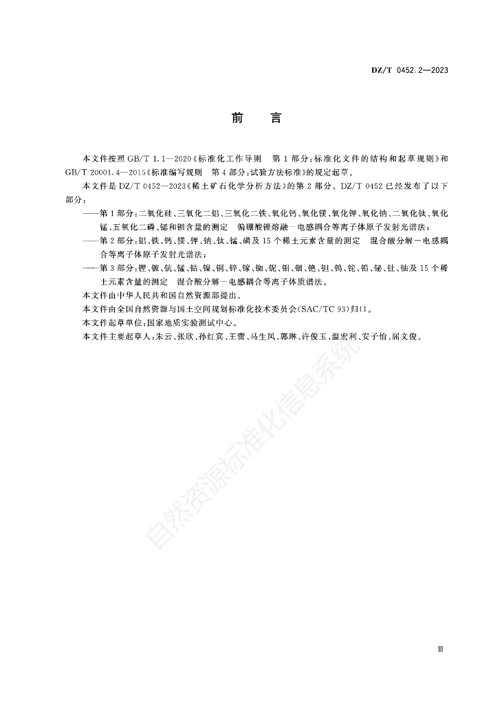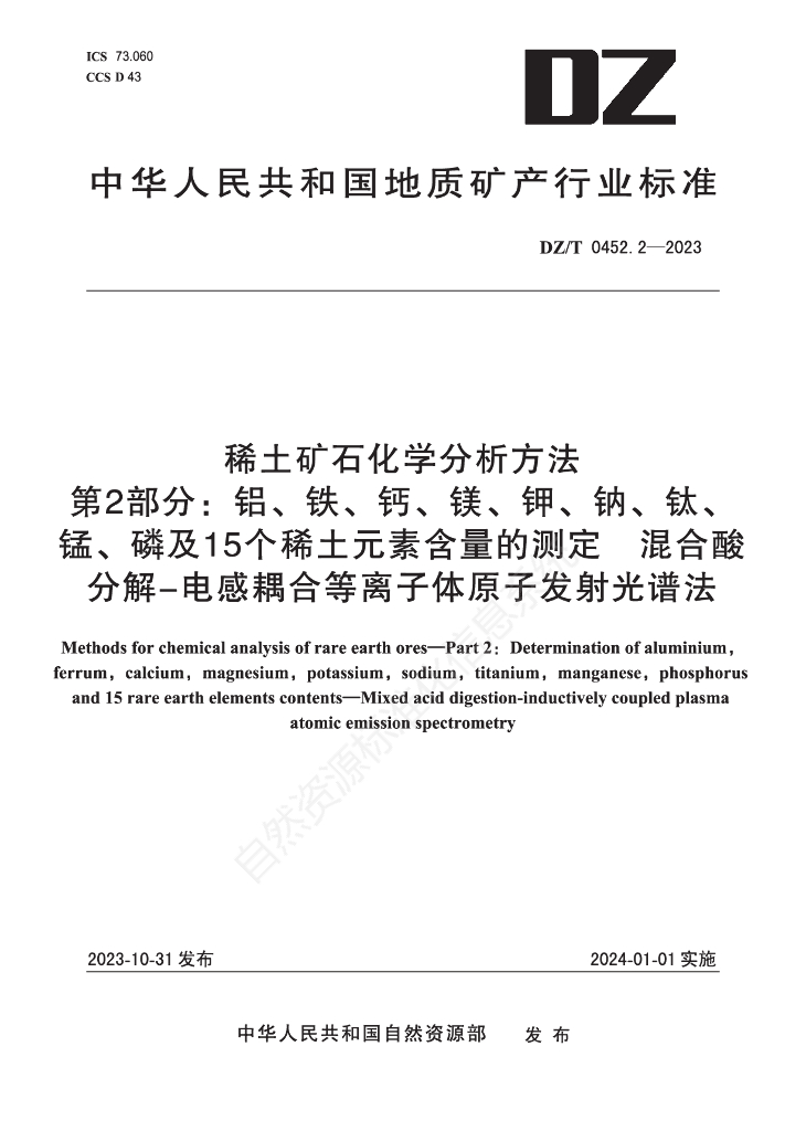 DZ/T 0452.2-2023 稀土矿石化学分析方法 第2部分:铝、铁、钙、镁、钾、钠、钛、锰、磷及15个稀土元素含量测定 混合酸分解―电感耦合等离子体原子发射光谱法