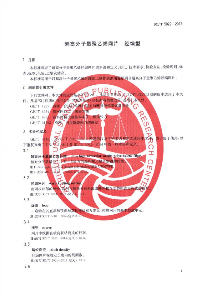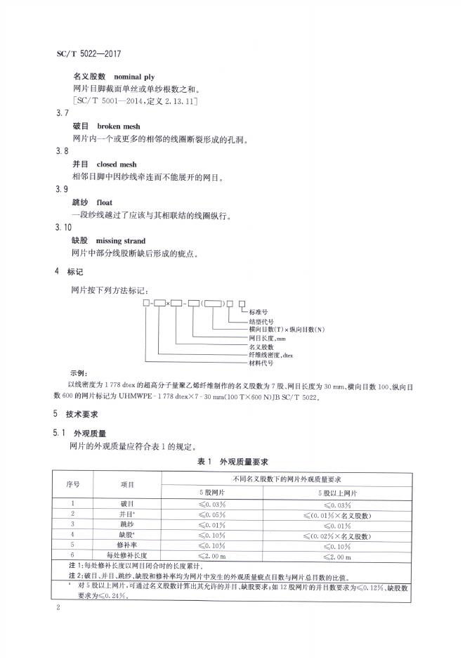 SC/T 5022-2017 超高分子量聚乙烯网片 经编型