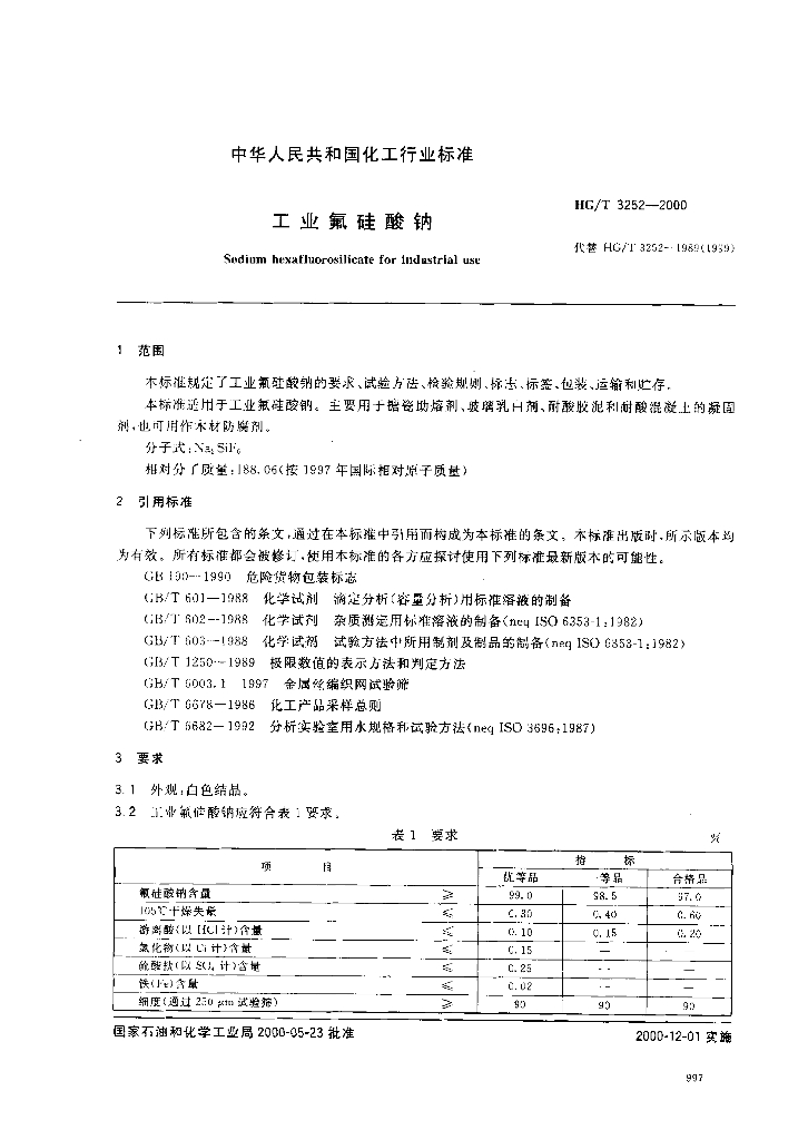 HG/T 3252-2000 工业氟硅酸钠