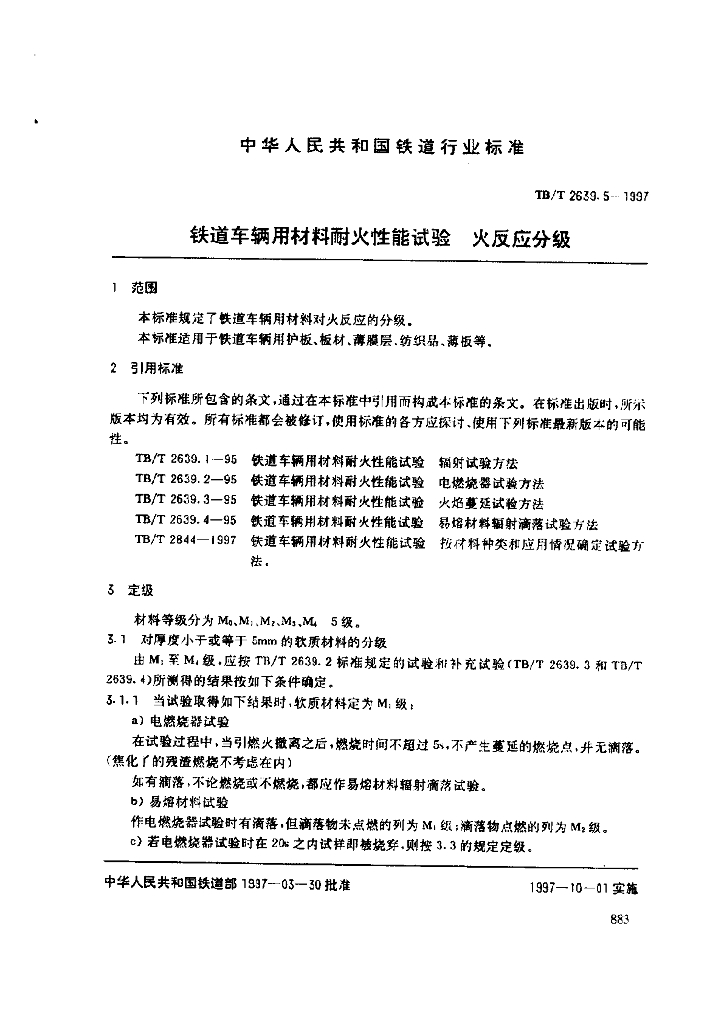 TB/T 2639.5-1997 铁道车辆用材料耐火性能试验.火反应分级