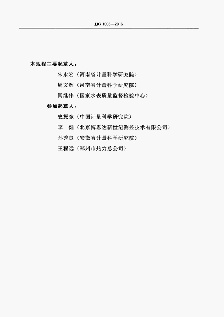 朱永宏(河南省计量科学研究院)、周文辉(河南省计量科学研究院)、间继伟(国家水表质量监督检验中心)、史振东(中国计量科学研究院)、李健(北京博思达新世纪测控技术有限公司)、孙秀良(安徽省计量科学研究院)、王程远(郑州市热力总公司)
