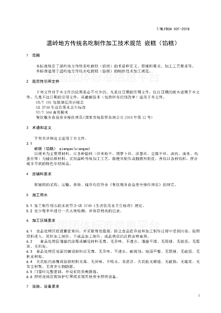 T/WLFBSA 001-2018 温岭地方传统名吃制作加工技术规范 嵌糕(馅糕)