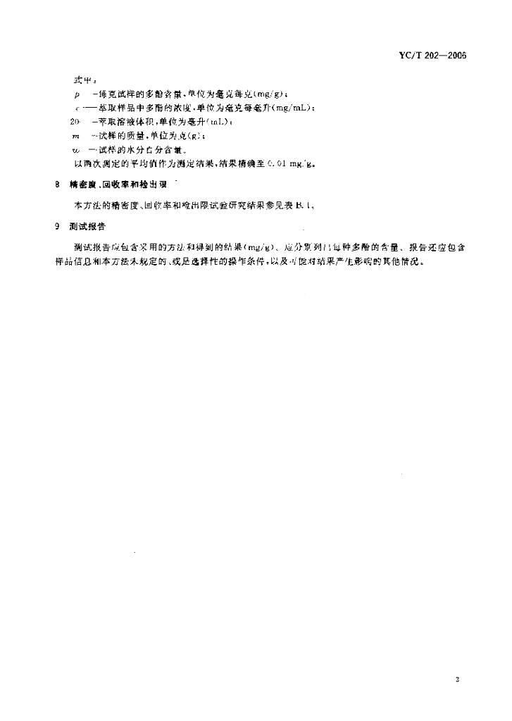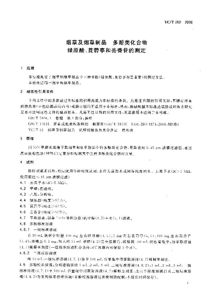 YC/T 202-2006 烟草及烟草制品 多酚类化合物绿原酸、莨菪亭和芸香苷的测定