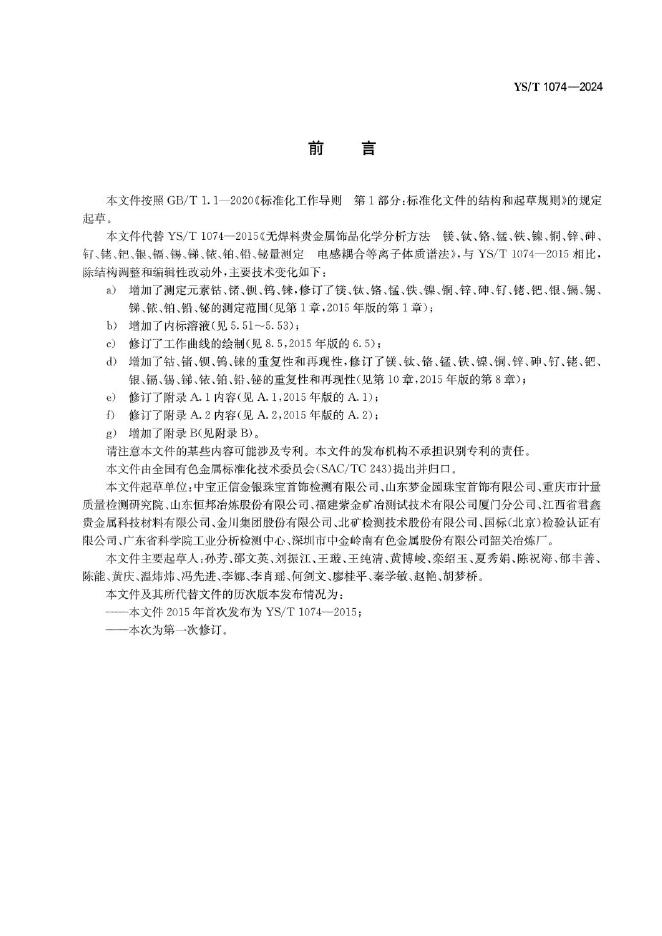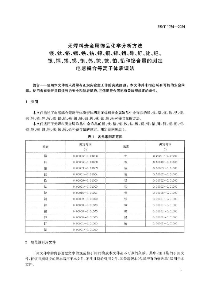 YS/T 1074-2024 无焊料贵金属饰品化学分析方法 镁、钛、铬、锰、铁、钴、镍、铜、锌、锗、砷、钌、铑、钯、银、镉、锡、锑、钡、钨、铼、铱、铂、铅和铋含量的测定 电感耦合等离子体质谱法
