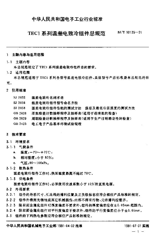 SJ/T 10135-1991 TEC1系列温差电致冷组件总规范