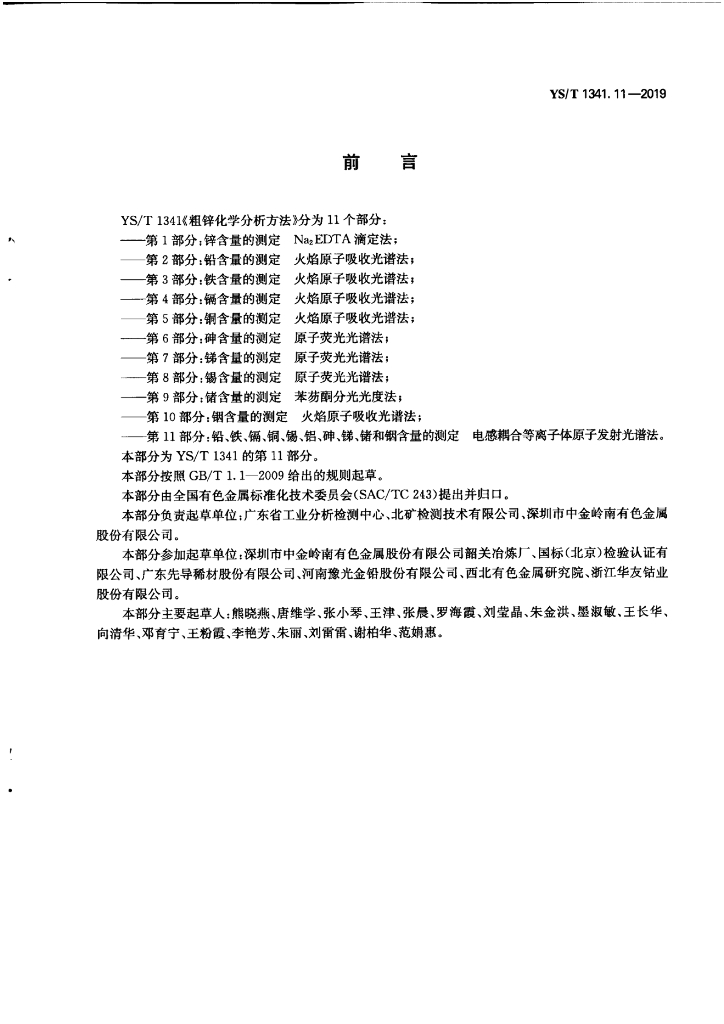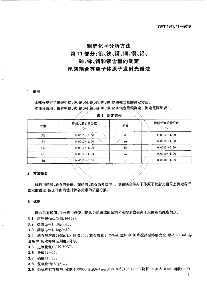 YS/T 1341.11-2019 粗锌化学分析方法 第11部分:铅、铁、镉、铜、锡、铝、砷、锑、锗和铟含量的测定 电感耦