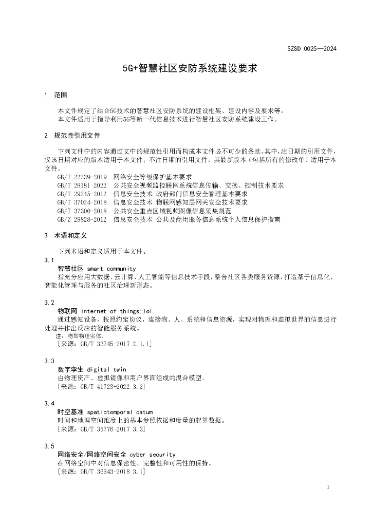 SZSD 0025-2024 5G+智慧社区安防系统建设要求