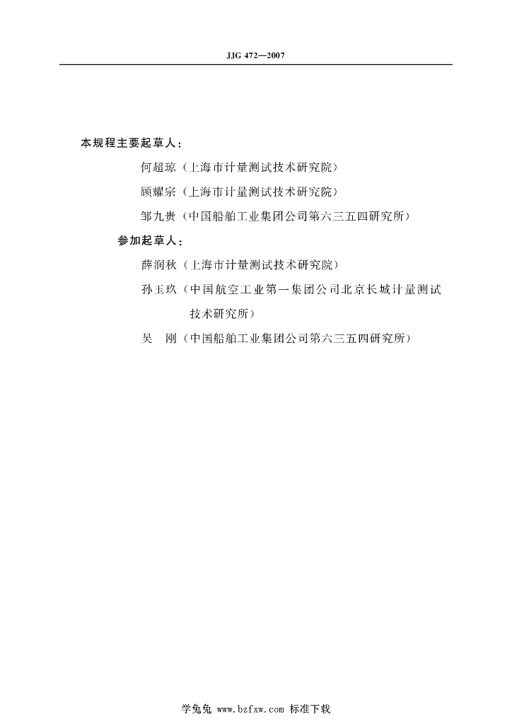何超琼(上海市计量测试技术研究院)、顾耀宗(上海市计量测试技术研究院)、邹九贵(中国船舶工业集团公司第六三五四研究所)、薛润秋(上海市计量测试技术研究院)、孙玉玖(中国航空工业第一集团公司北京长城计量测试技术研究所)、吴刚(中国船舶工业集团公司第六三五四研究所)