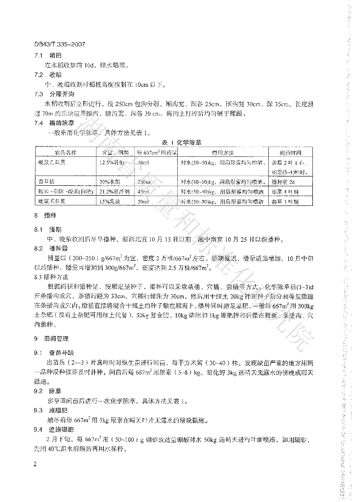 DB43/T 335-2007 稻田油菜免耕直播栽培技术规程