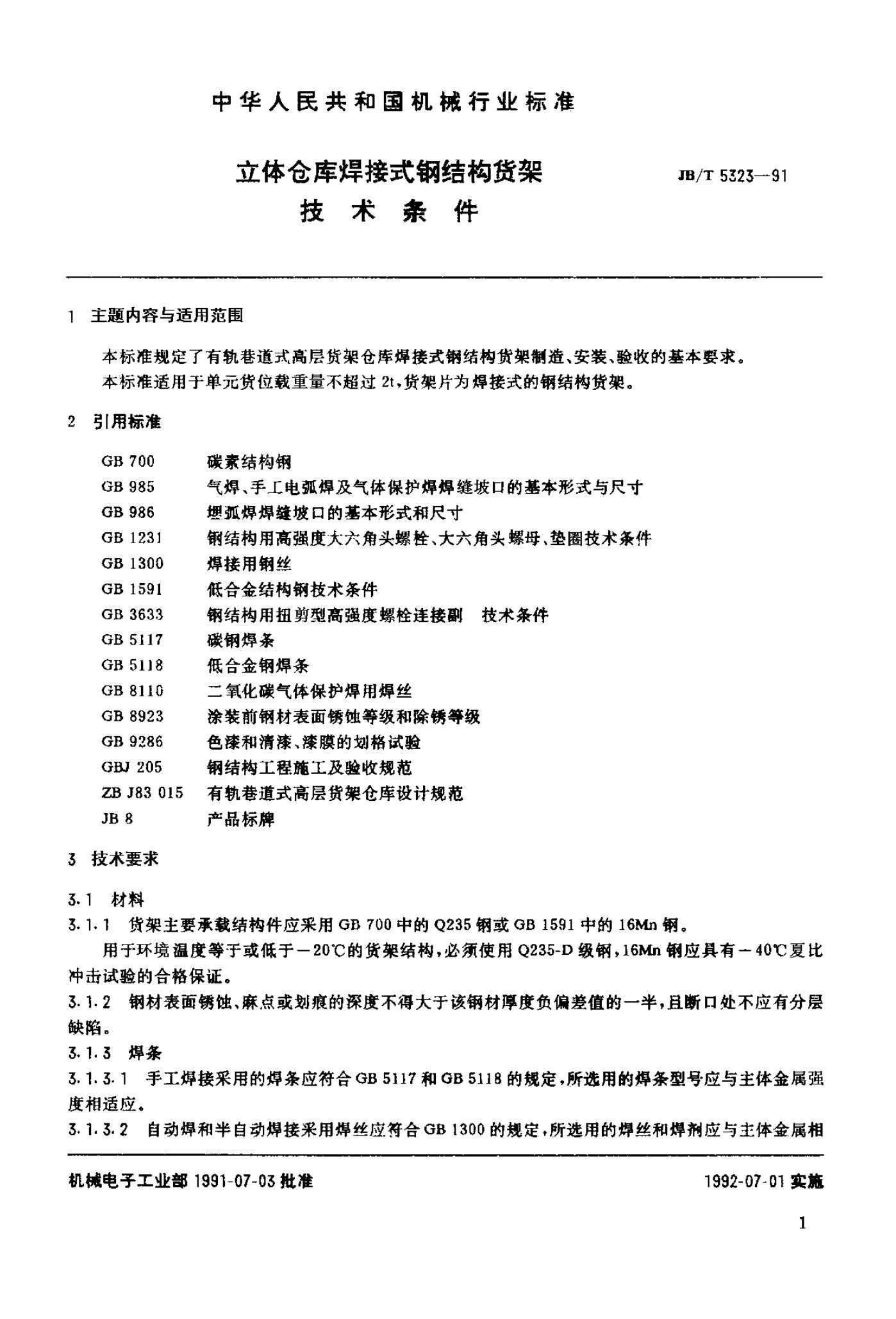 JB/T 5323-1991 主体仓库焊接式钢结构货架技术要求