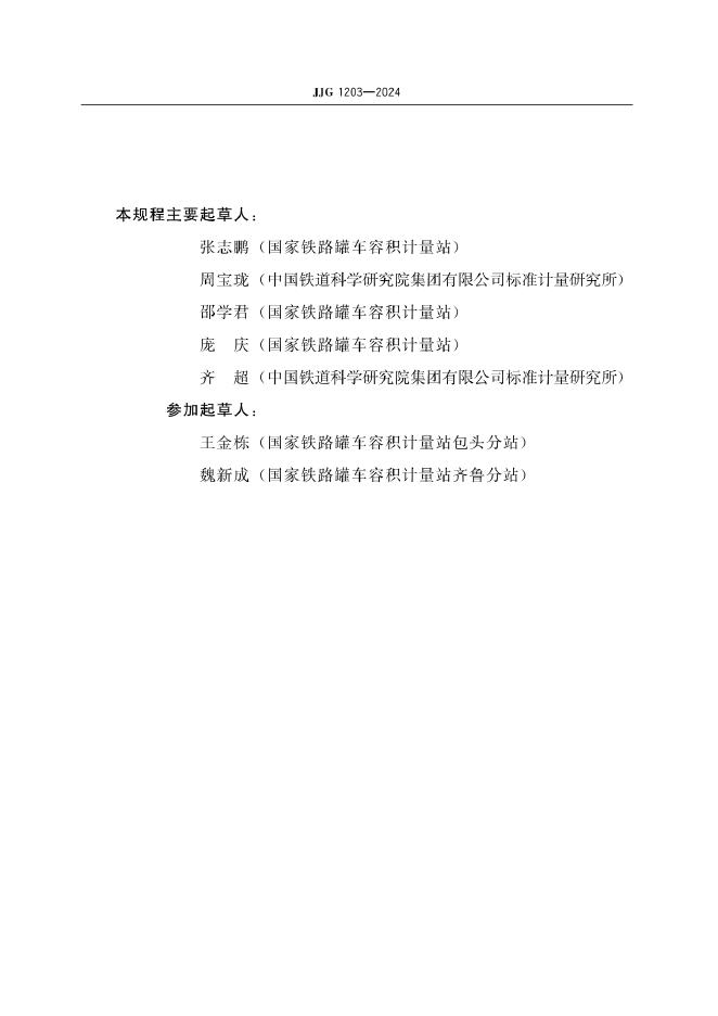 张志鹏(国家铁路罐车容积计量站)、周宝珑(中国铁道科学研究院集团有限公司标准计量研究所)、邵学君(国家铁路罐车容积计量站)、庞庆(国家铁路罐车容积计量站)、齐超(中国铁道科学研究院集团有限公司标准计量研究所)、王金栋(国家铁路罐车容积计量站包头分站)、魏新成(国家铁路罐车容积计量站齐鲁分站)
