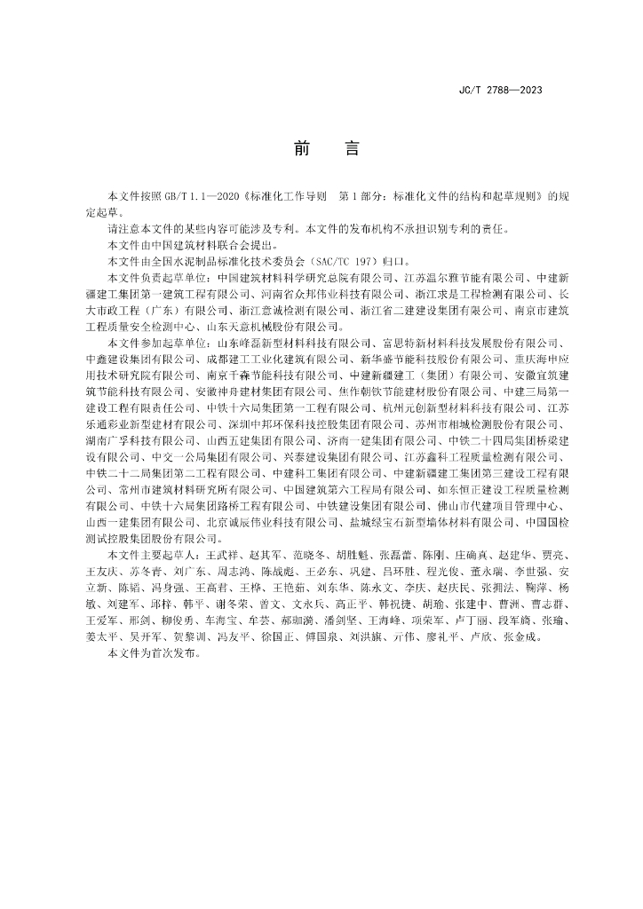 中国建筑材料科学研究总院有限公司、江苏温尔雅节能有限公司、中建新疆建工集团笫一建筑工程有限公司、河南省众邦伟业科技有限公司、浙江求是工程检测有限公司、长大市政工程(广东)有限公司、浙江意诚检测有限公司、浙江省二建建设集团有限公司、南京市建筑工程质量安全检测中心、山东天意机械股份有限公司、山东峰磊新型材料科技有限公司、富思特新材料科技发展股份有限公司、中鑫建设集团有限公司、成都建工工业化建筑有限公司、新华盛节能科技股份有限公司、重庆海申应用技术研究院有限公司、南京千森节能科技有限公司、中建新疆建工(集团)有