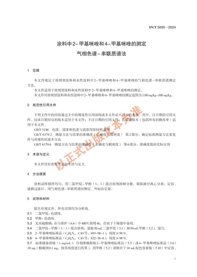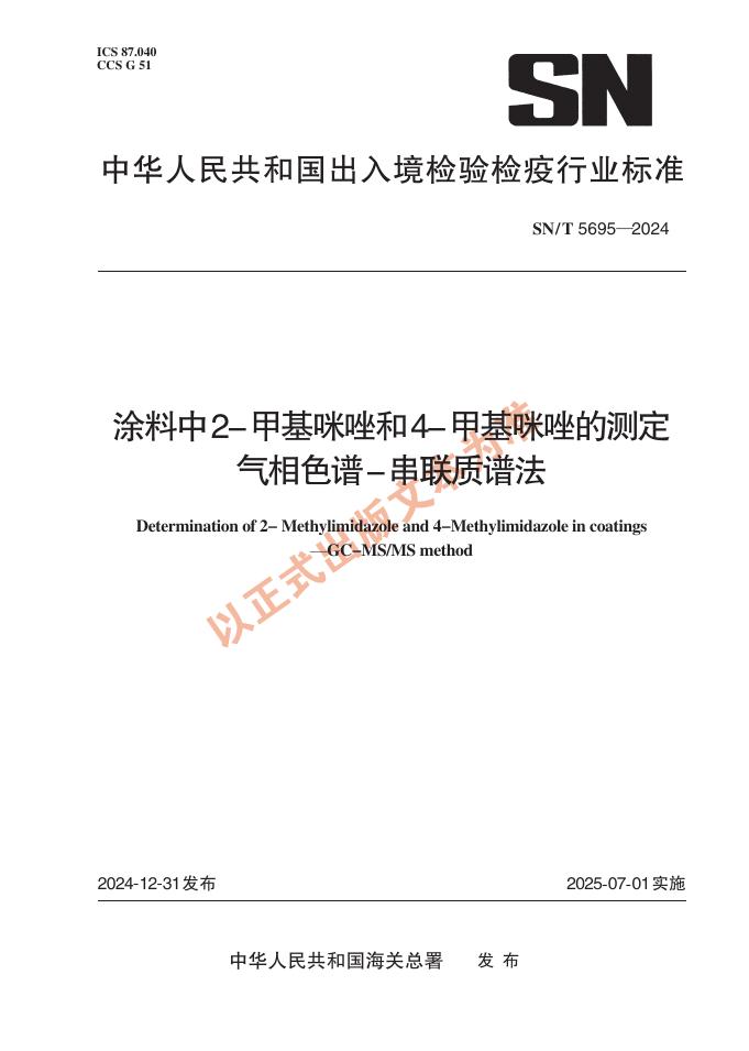 SN/T 5695-2024 涂料中2-甲基咪唑和4-甲基咪唑的测定 气相色谱-串联质谱法