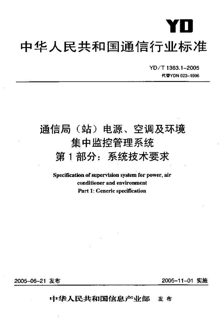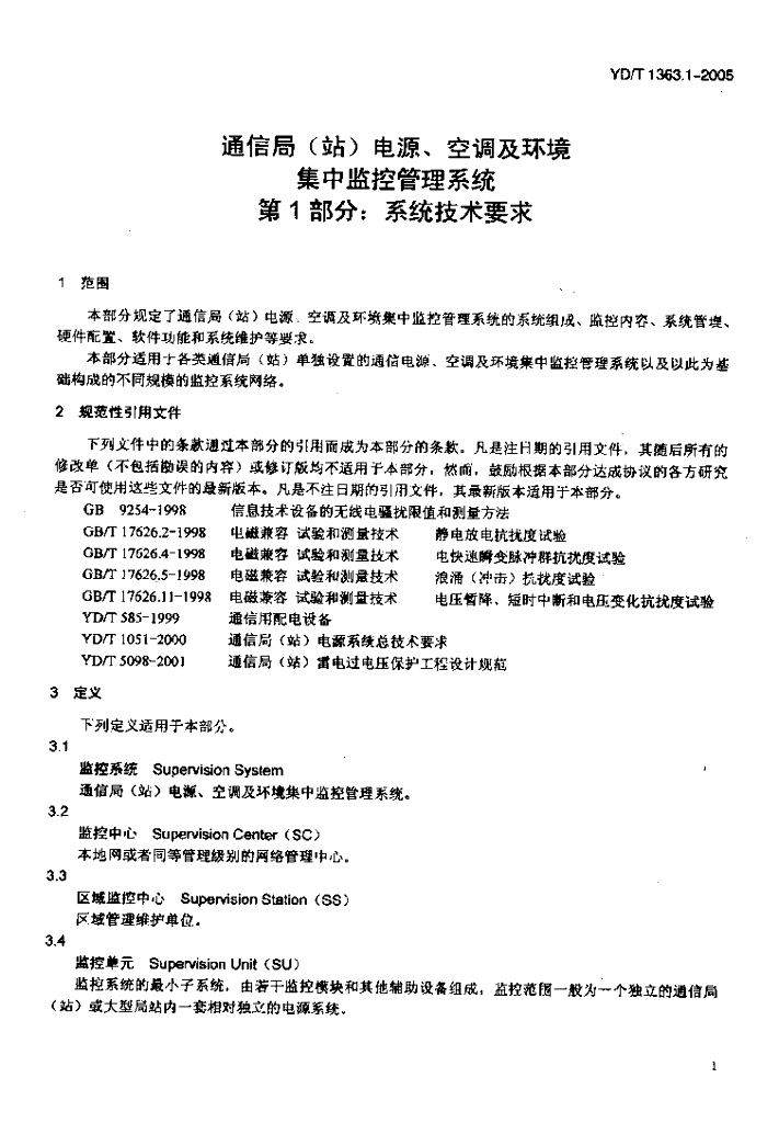 YD/T 1363.1-2005 通信局(站)电源、空调及环境集中监控管理系统 第1部分:系统技术要求