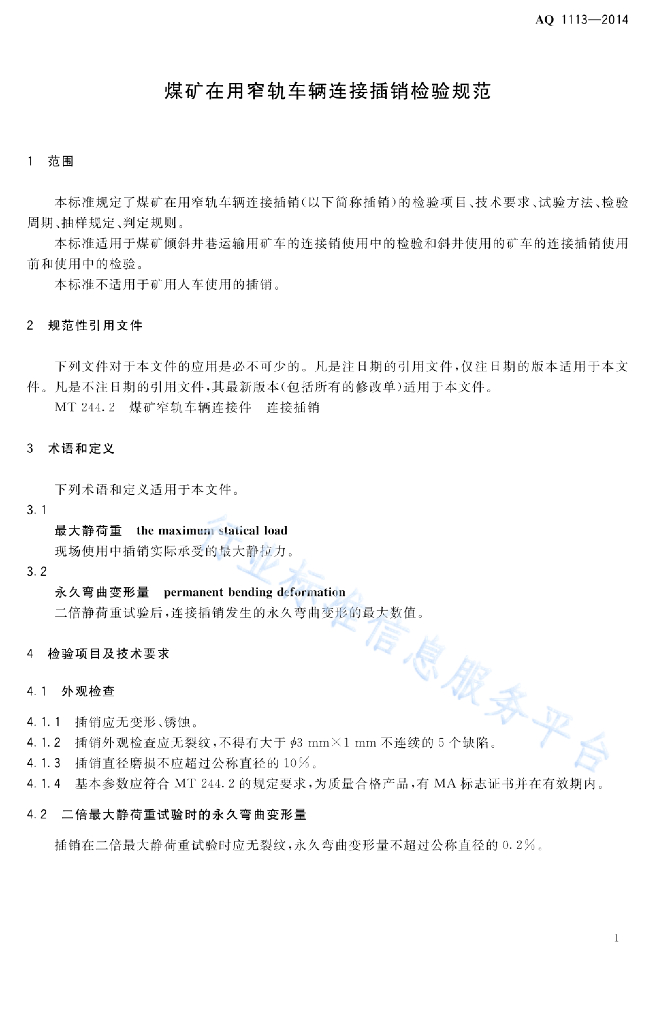 AQ 1113-2015 煤矿在用窄轨车辆连接插销检验规范