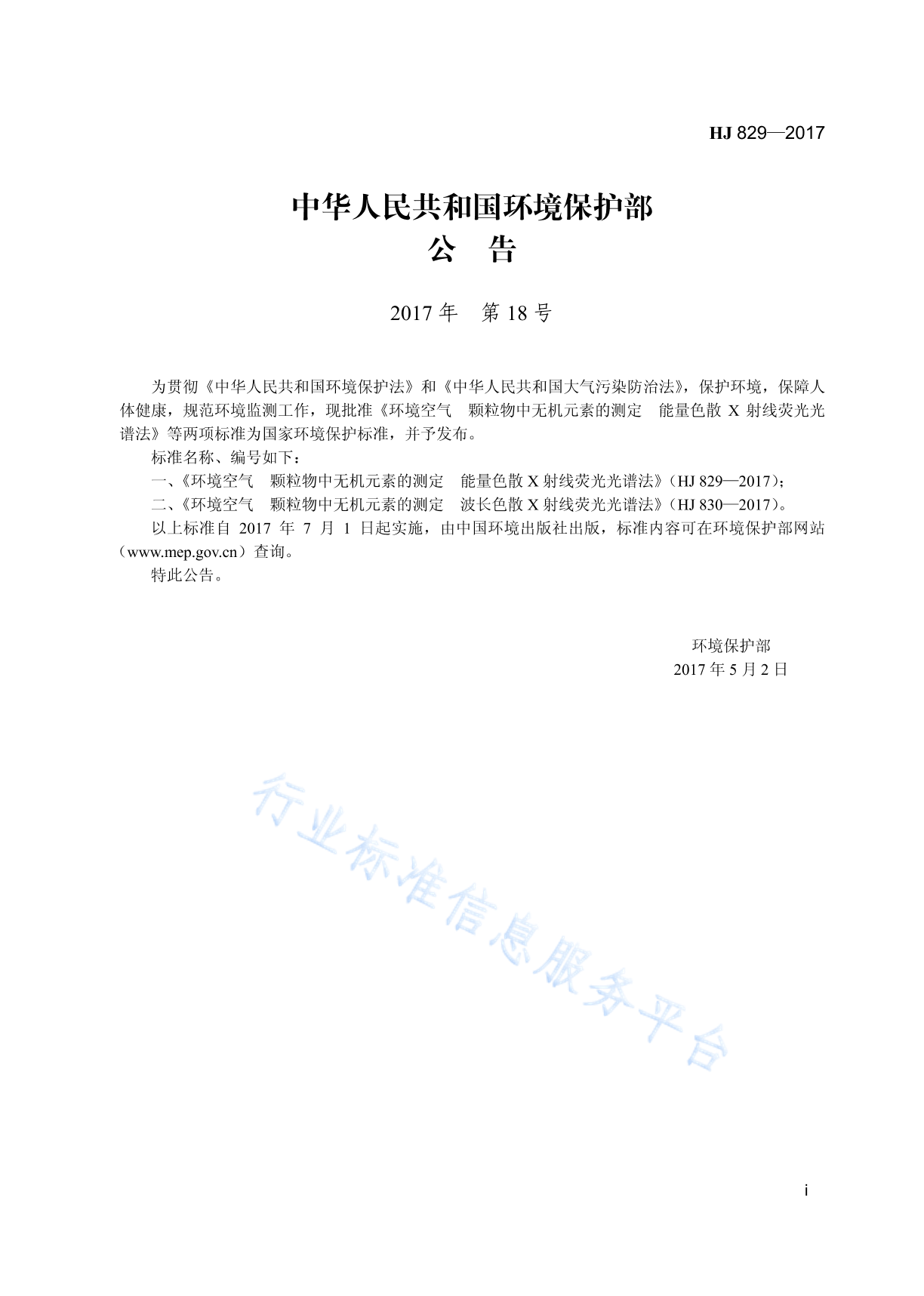 HJ 829-2017 环境空气 颗粒物中无机元素的测定 能量色散X射线荧光光谱法