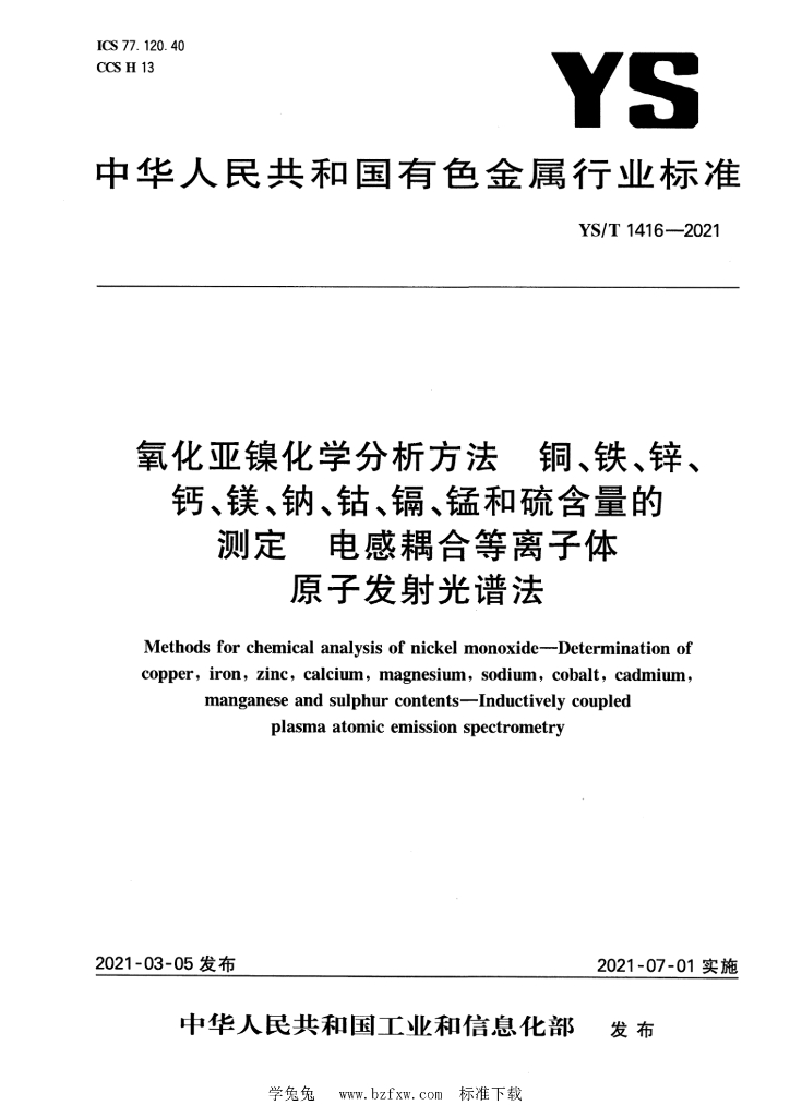 YS/T 1416-2021 氧化亚镍化学分析方法 铜、铁、锌、钙、镁、钠、钴、镉、锰和硫含量的测定 电感耦合等离子体原子发射光谱法