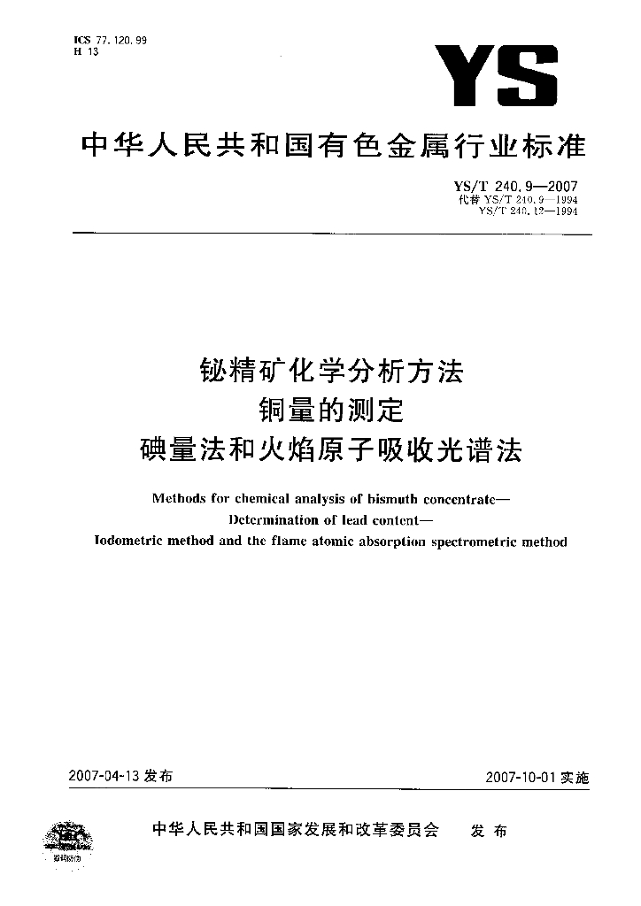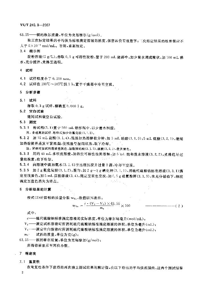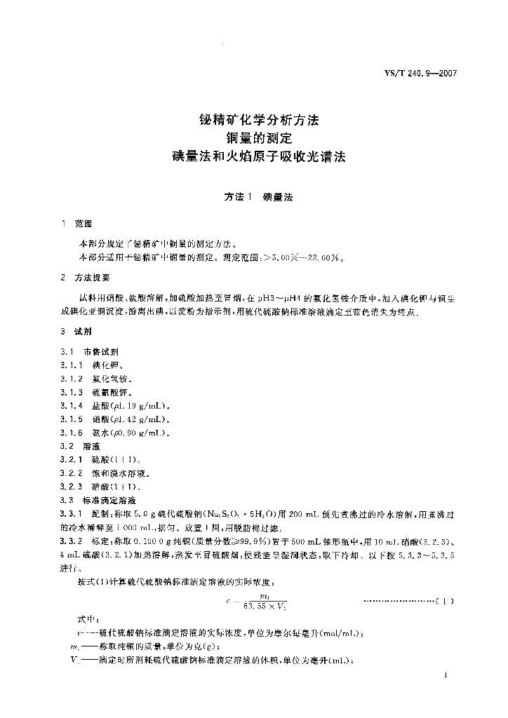 YS/T 240.9-2007 铋精矿化学分析方法 铜量的测定 碘量法和火焰原子吸收光谱法