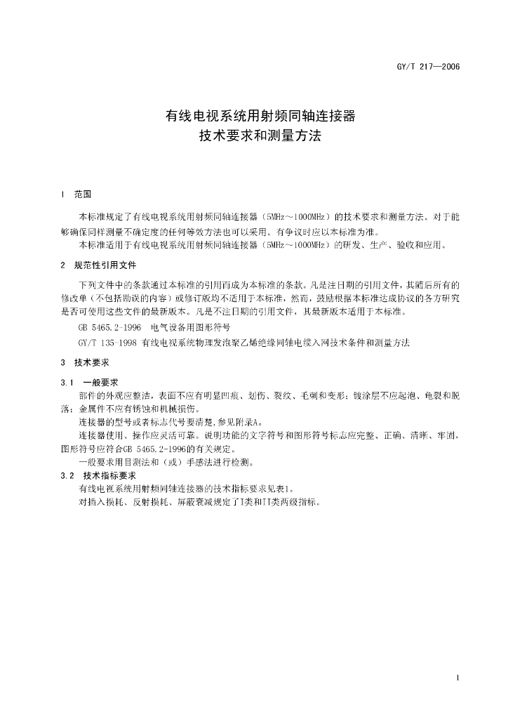 GY/T 217-2006 有线电视系统用射频同轴连接器技术要求和测量方法