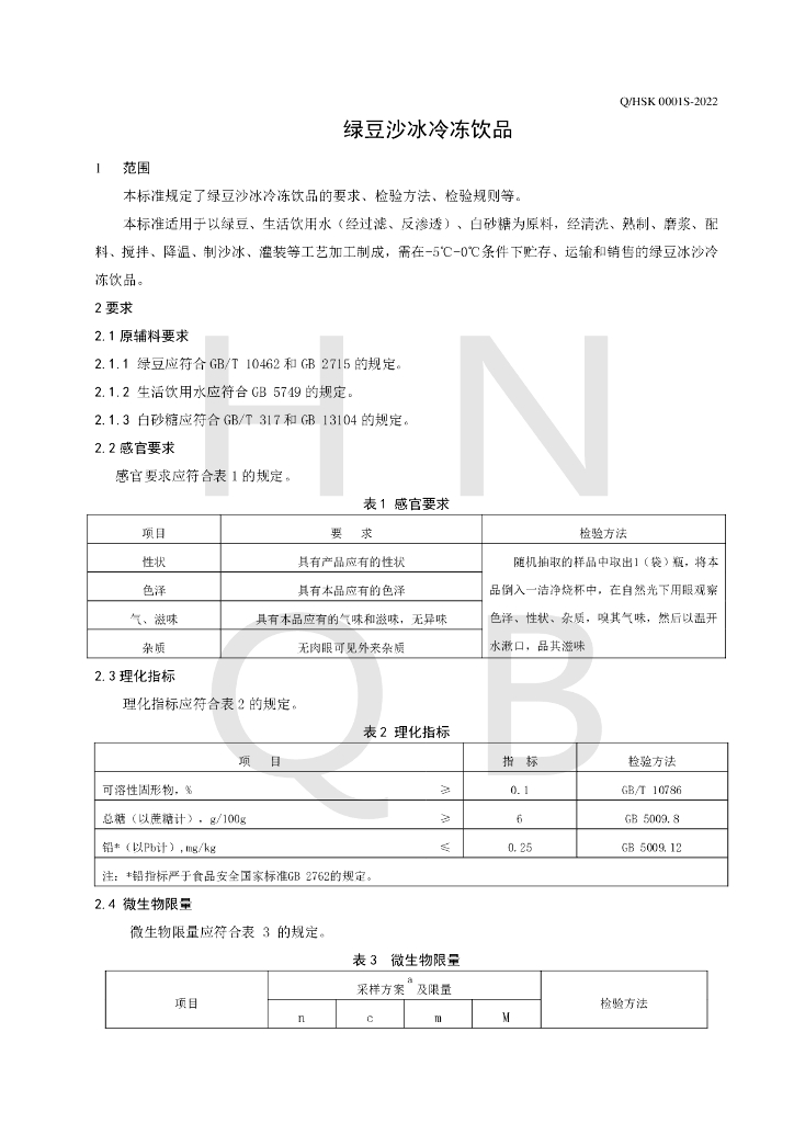Q/HSK 0001S-2022 绿豆沙冰冷冻饮品