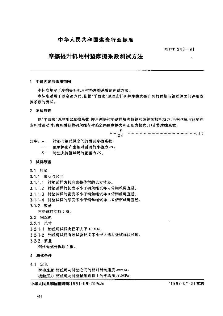 MT/T 248-1991 摩擦提升机用衬垫摩擦系数测试方法