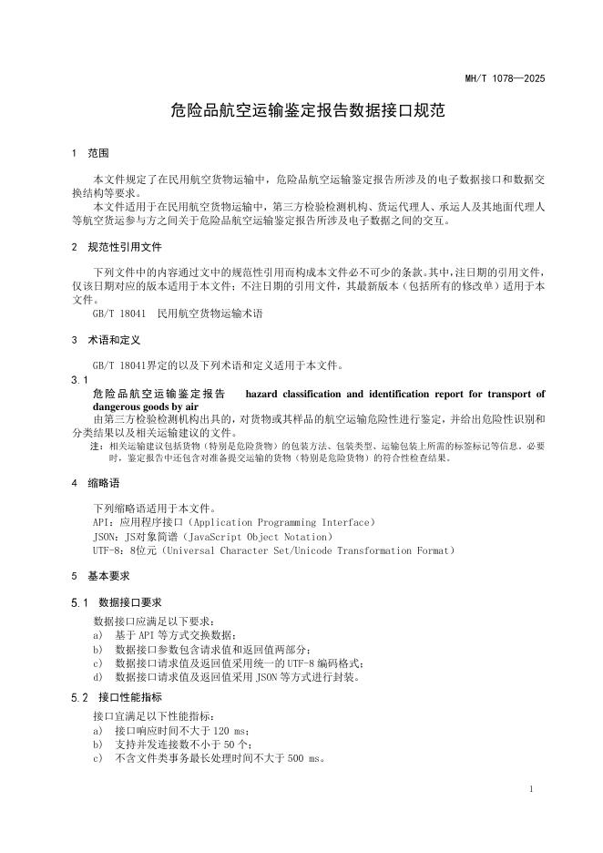 MH/T 1078-2025 危险品航空运输鉴定报告数据接口规范