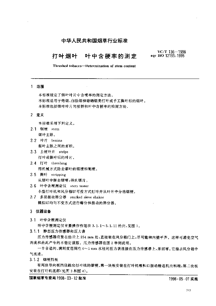 YC/T 136-1998 打叶烟叶 叶中含梗率的测定