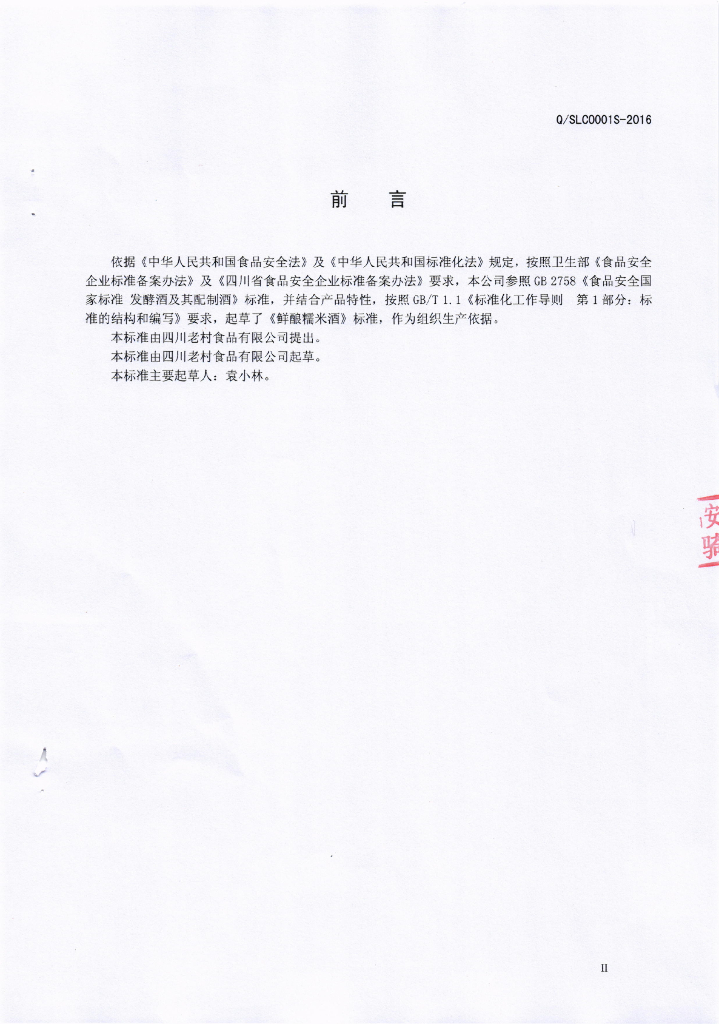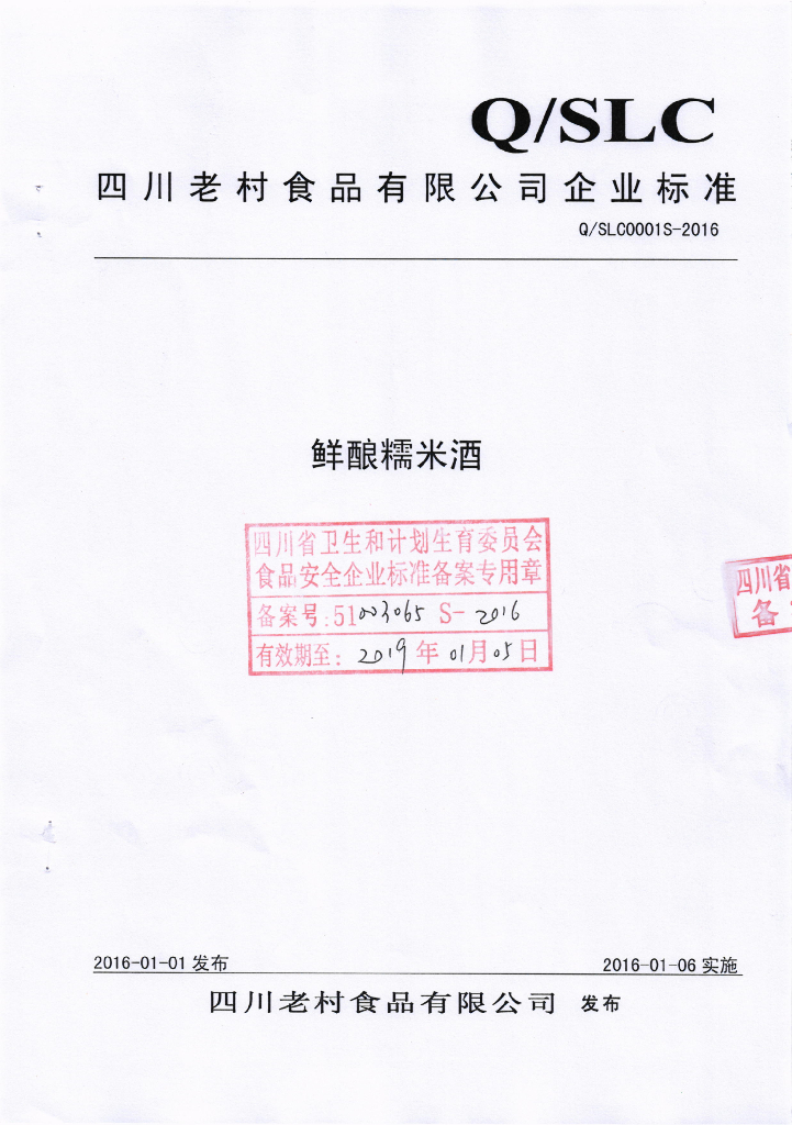 Q/SLC 0001S-2016 四川老村食品有限公司 鲜酿糯米酒