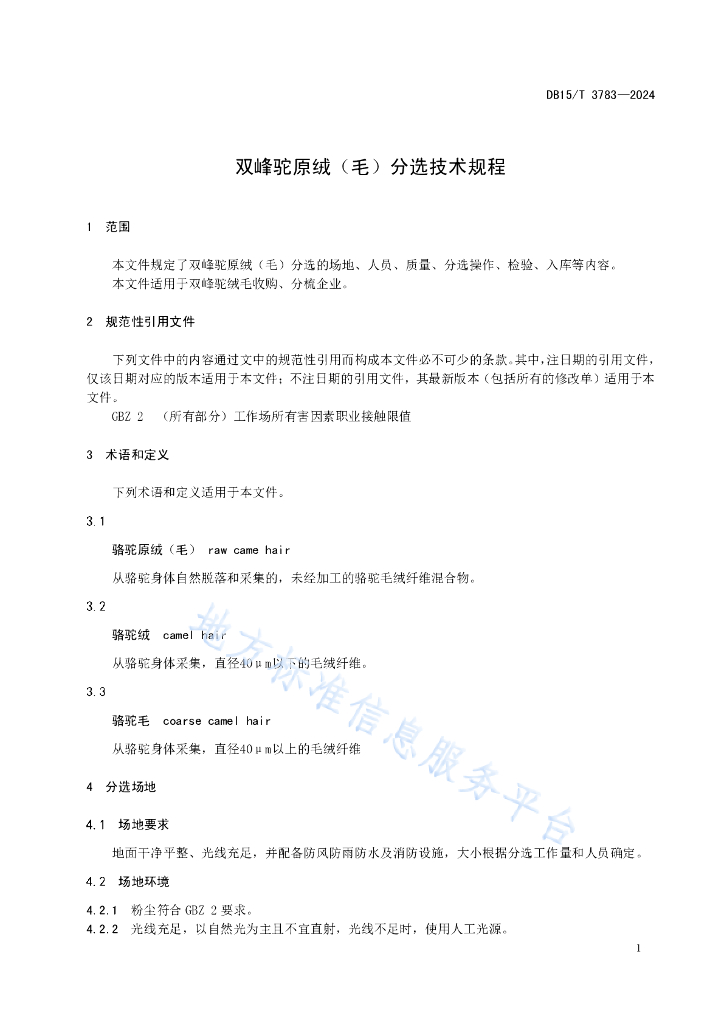 DB15/T 3783-2024 双峰驼原绒(毛)分选技术规程