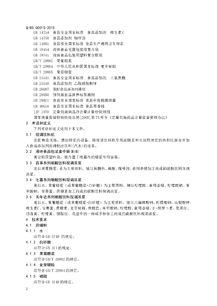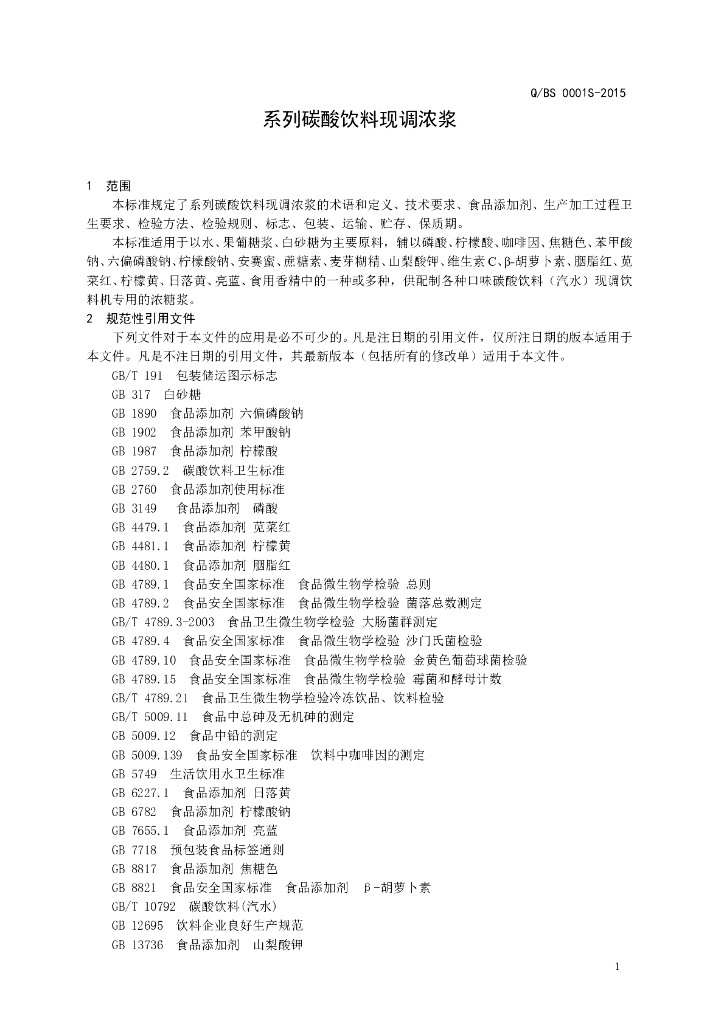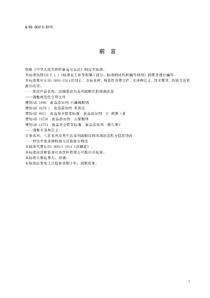 Q/BS 0001S-2015 济南百事可乐饮料有限公司 系列碳酸饮料现调浓浆