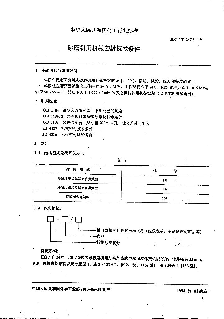 HG/T 2477-1993 砂磨机用机械密封技术条件