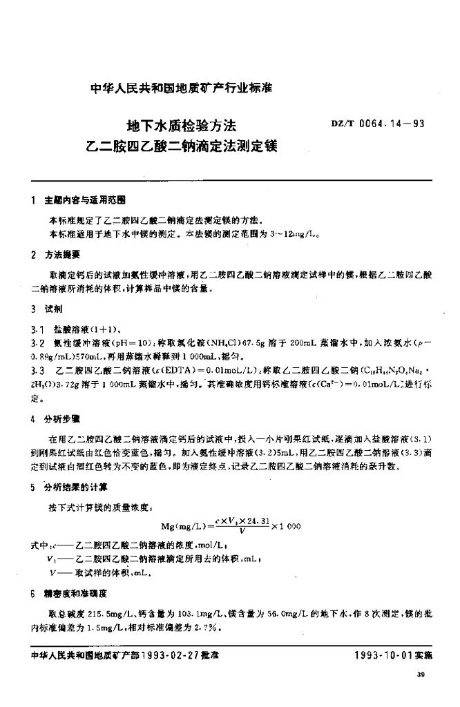 DZ/T 0064.14-1993 地下水质检验方法 乙二胺四乙酸二钠滴定法测定镁