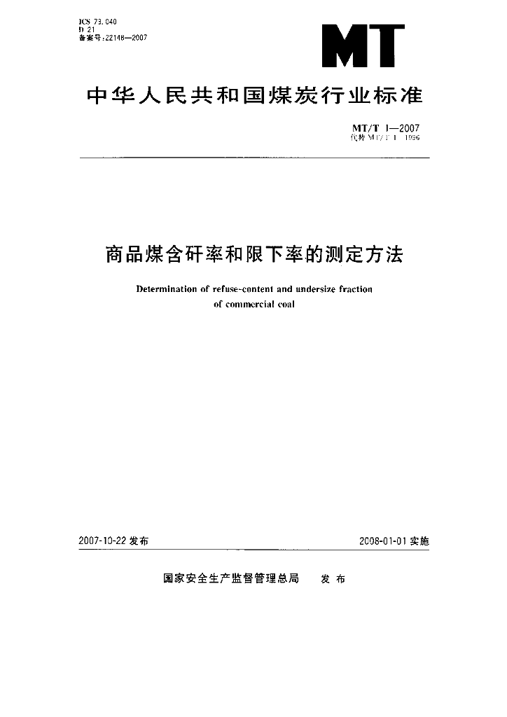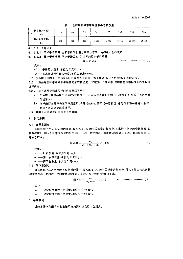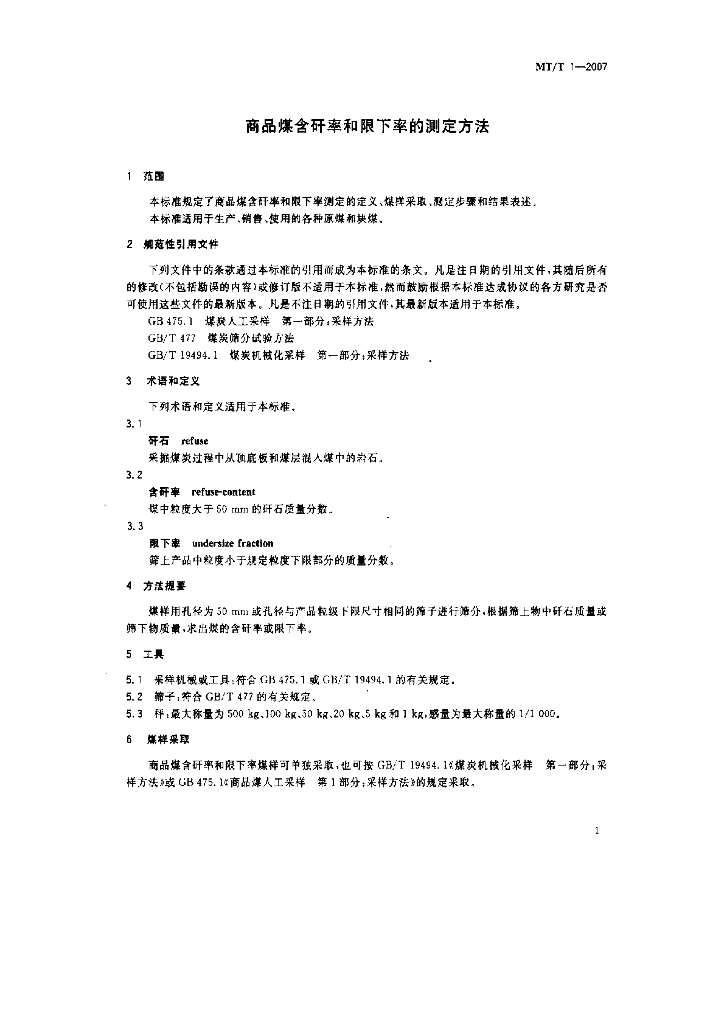 MT/T 1-2007 商品煤含矸率和限下率的测定方法