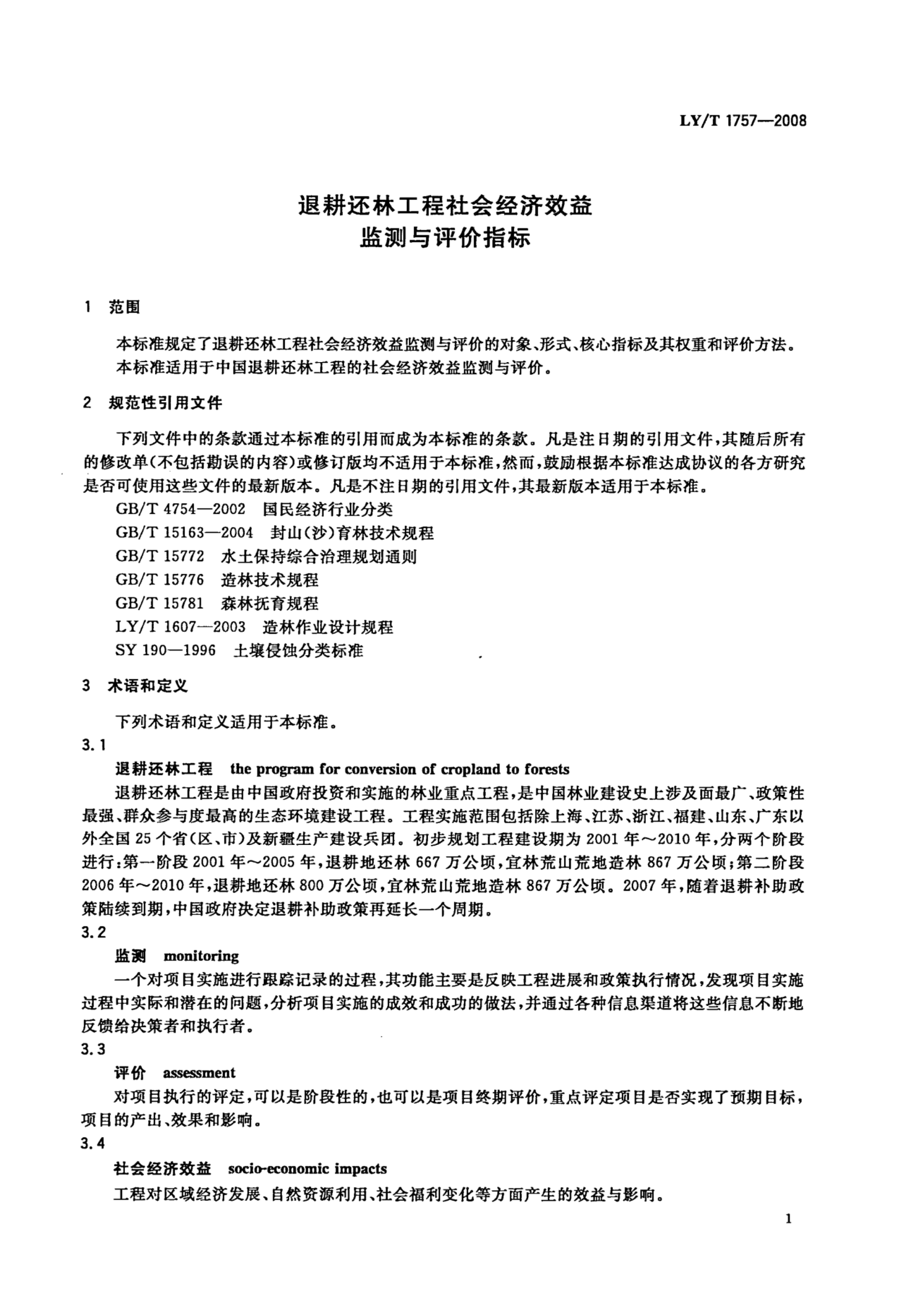 LY/T 1757-2008 退耕还林工程社会经济效益 监测与评价指标