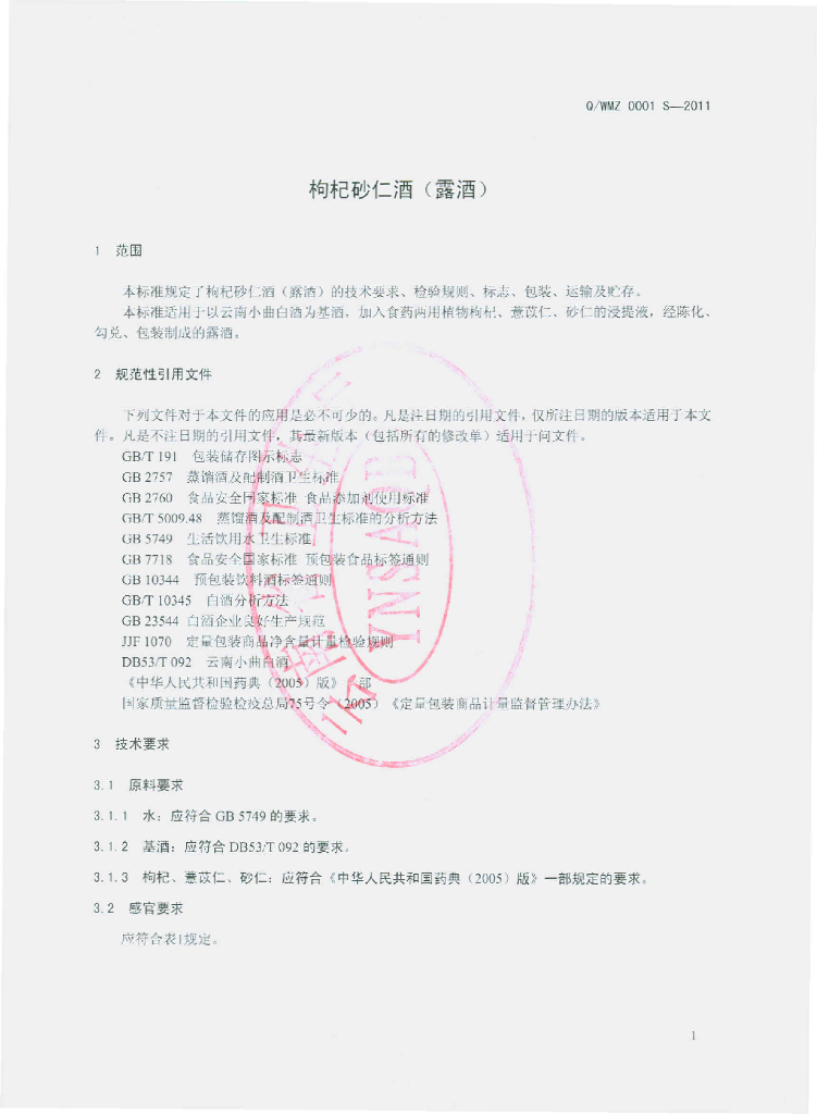 Q/WMZ 0001S-2011 枸杞砂仁酒(露酒)
