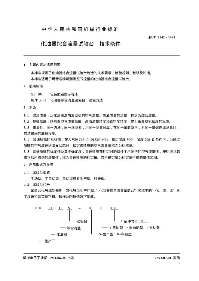 JB/T 5142-1991 化油器综合流量试验台 技术条件
