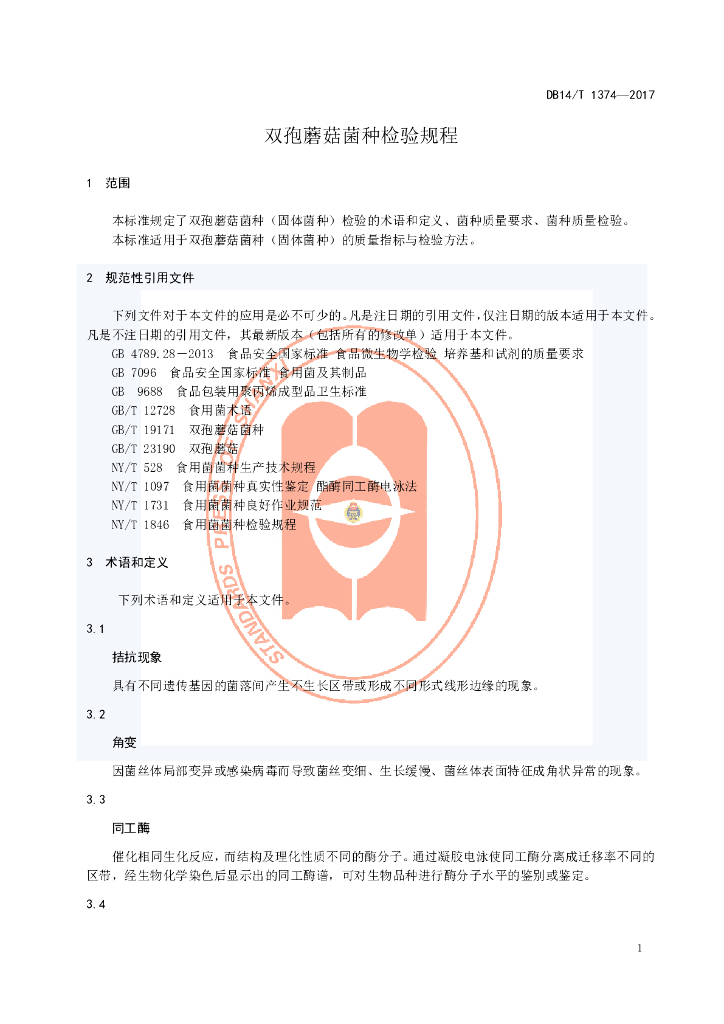 DB14/T 1374-2017 双孢蘑菇菌种检验规程
